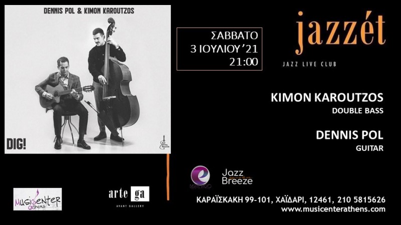 Το Σάββατο 3 Ιουλίου στις 9.00 το βράδυ, ο μουσικός διάλογος του Dennis Pol και του Κίμων Καρούτζου που συνδυάζει bebop μελωδίες με blues feeling και εκλεπτυσμένους αυτοσχεδιασμούς θα γοητεύσει το εξαιρετικό κοινό του Jazzét Café.