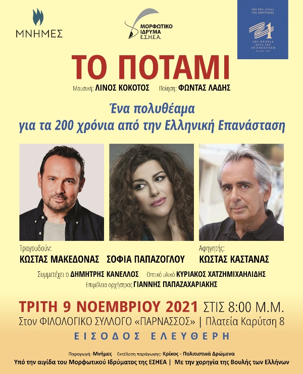 Ένα μουσικό πολυθέαμα για την ιστορία των Ελλήνων με άξονα την Επανάσταση του 1821 βασισμένο στο έργο «Το ποτάμι» σε μουσική Λίνου Κόκοτου και ποίηση Φώντα Λάδη, θα παρουσιαστεί στην αίθουσα του Φιλολογικού Συλλόγου «Παρνασσός».