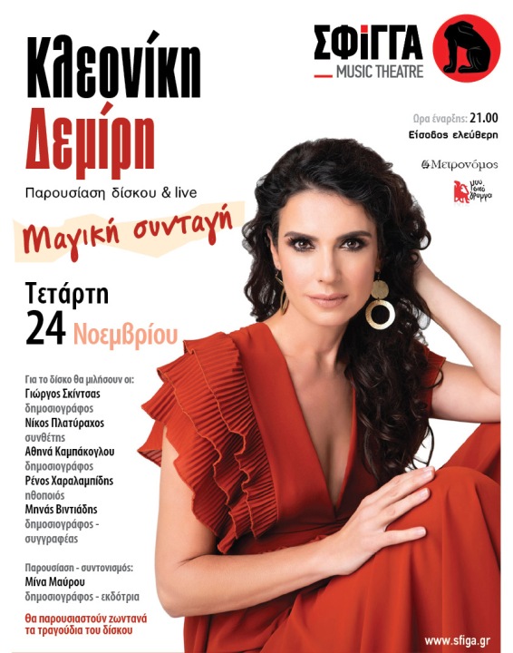 Η Κλεονίκη Δεμίρη παρουσιάζει τη "Μαγική Συνταγή", τον πρώτο της προσωπικό δίσκο, που κυκλοφορεί από τον «Μετρονόμο», στη ''Σφίγγα'' την Τετάρτη 24 Νοεμβρίου στις 21:00.