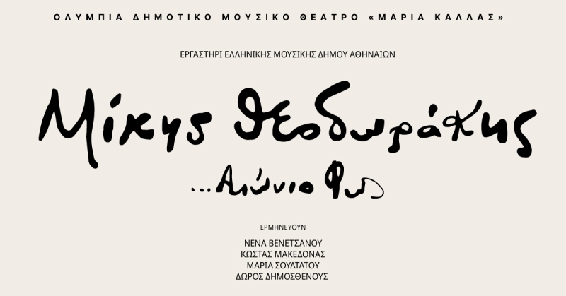 Το Εργαστήρι Ελληνικής Μουσικής του Δήμου Αθηναίων συμπράττει με τη Νένα Βενετσάνου, τον Κώστα Μακεδόνα, τη Μαρία Σουλτάτου και το Δώρο Δημοσθένους, την Τρίτη 23 Νοεμβρίου στις 20.30 στο Ολύμπια, Δημοτικό Μουσικό Θέατρο "Μαρία Κάλλας", σε μία συναυλία-αφιέρωμα στην εμβληματική μορφή της σύγχρονης Ελληνικής ιστορίας, τον Μίκη Θεοδωράκη.