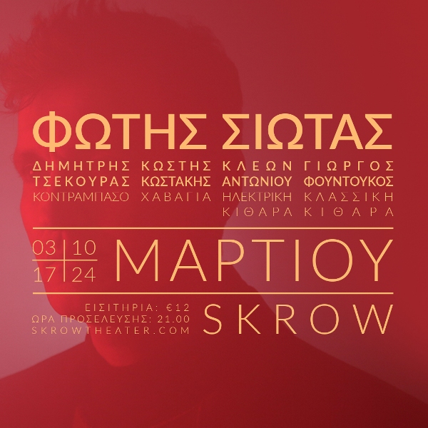 Τον πρώτο μήνα της άνοιξης, λίγο μετά την κυκλοφορία του δεύτερου προσωπικού του δίσκου, ο Φώτης μας καλεί τις τέσσερις πρώτες Πέμπτες του Μαρτίου σε μια σειρά από full band lives. Mε εκλεκτή παρέα, τον Δημήτρη Τσεκούρα στο μπάσο, τον Κλέωνα Αντωνίου στην ηλεκτρική κιθάρα, τον Κωστή Κωστάκη στην χαβάγια και τον Γιώργο Φουντούκο στην κλασική κιθάρα, θα καταλάβουν ξανά τη σκηνή του Skrow Theater για να μας παίξουν τραγούδια νέα και παλιά, να μας πουν τις ιστορίες τους και να μοιραστούν μαζί μας αισθήματα, αναμνήσεις αλλά και μια φρέσκια πρόταση για τον σύγχρονο λαϊκό και έντεχνο ήχο.