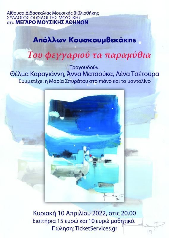 Ο συνθέτης Απόλλων Κουσκουμβεκάκης έρχεται την Κυριακή 10 Απριλίου στο Μέγαρο Μουσικής Αθηνών με την παράσταση «Του φεγγαριού τα παραμύθια». Τραγούδια από την προσωπική του δισκογραφία «συνομιλούν» με αγαπημένα τραγούδια από όλο τον κόσμο, παραδοσιακά, έντεχνα, jazz και latin standards κ.α.