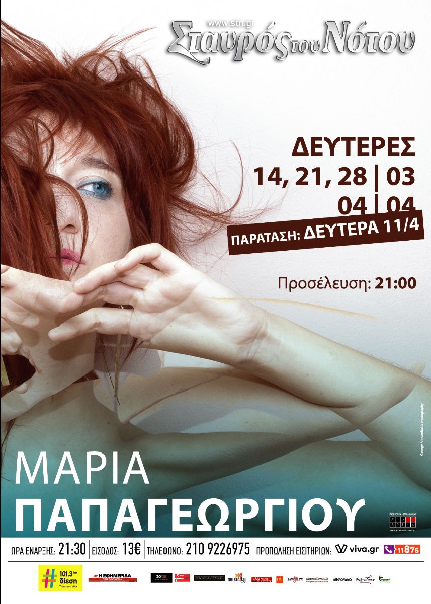 Η Μαρία Παπαγεωργίου ολοκληρώνει τις επιτυχημένες εμφανίσεις της τις Δευτέρες στην Κεντρική Σκηνή του Σταυρού του Νότου, με μία επιπλέον παράσταση, τη Δευτέρα 11 Απριλίου.