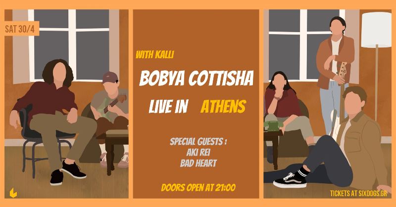 Oι Bobya Cottisha έρχονται για πρώτη φορά στην Αθήνα, στο stage του six d.o.g.s. Έχοντας ήδη ένα album και δύο singles στο ενεργητικό τους, η neo - soul / indie μπάντα από τη Θεσσαλονίκη πρόκειται να παρουσιάσει τα κομμάτια του δεύτερου επερχόμενου album της, με τίτλο "LUNCH BREAK".