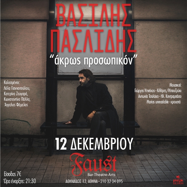 Σας περιμένουμε στο χώρο του Faust την Δευτέρα 12 Δεκεμβρίου να ακούσουμε τραγούδια με τον τρόπο που γράφονται, σε ένα σκηνικό «άκρως προσωπικόν»!