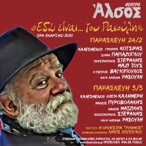 Δύο μοναδικές παραστάσεις – αφιέρωμα στον σπουδαίο δημιουργό Μανώλη Ρασούλη, με το χαρακτηριστικό τίτλο «Εδώ είναι του Ρασούλη» και τη συμμετοχή σημαντικών ερμηνευτών και μουσικών, θα έχει την ευκαιρία να απολαύσει το αθηναϊκό κοινό στο Θέατρο Άλσος, την Παρασκευή 24 Φεβρουαρίου και την Παρασκευή 3 Μαρτίου 2023.