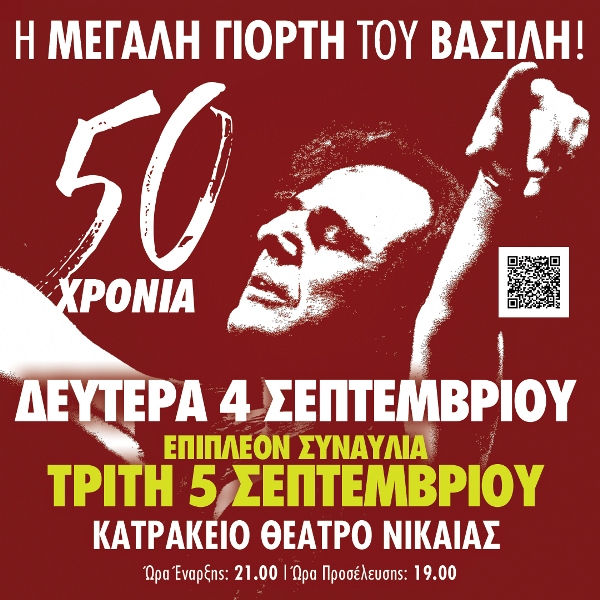 Αυτή η μεγάλη γιορτή για τα 50 χρόνια του Βασίλη συνεχίζεται σε όλη την Ελλάδα και κάνει δύο τελευταίες στάσεις στην Αθήνα τη Δευτέρα 4 Σεπτεμβρίου και την Τρίτη 5 Σεπτεμβρίου στο Κατράκειο Θέατρο Νίκαιας.