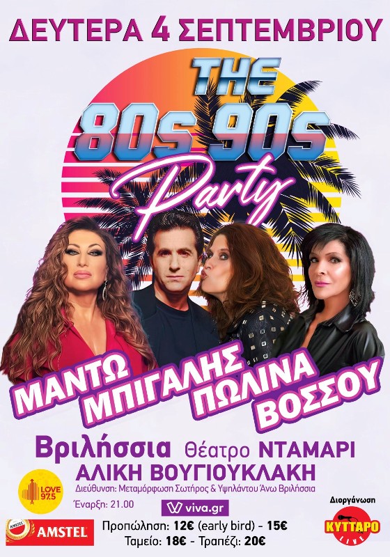 Τα τέσσερα κορυφαία ονόματα της ποπ σκηνής των 80s και 90s στην Ελλάδα, το περιβόητο «80s-90s Party» για πρώτη φορά στο πανέμορφο θέατρο «Νταμάρι - Αλίκη Βουγιουκλάκη» στους πρόποδες της Πεντέλης, στα Βριλήσσια!!