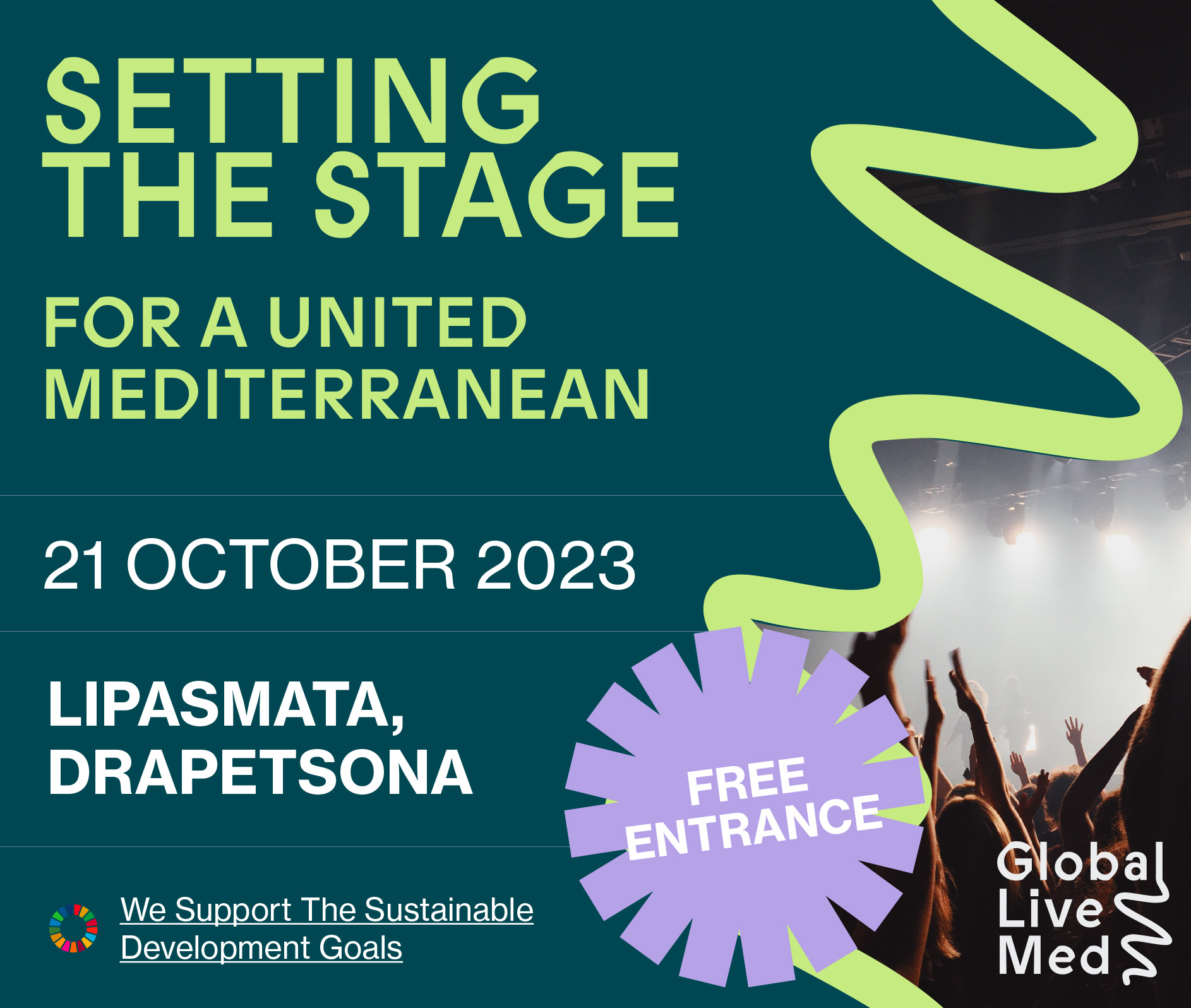 Με ένα πλούσιο μουσικό line up επιστρέφει το Σάββατο 21 Οκτωβρίου στην Αθήνα το Global Live Med, η ετήσια ημερίδα διαλόγου και μουσικής που διοργανώνει ο ομώνυμος μη κερδοσκοπικός οργανισμός με έδρα την Ελβετία για την προώθηση των Στόχων Βιώσιμης Ανάπτυξης (SDGs) του ΟΗΕ γύρω από τη Μεσόγειο.