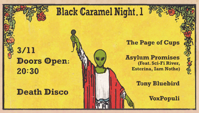 Συμμετέχουν καλλιτέχνες που συνεργάζονται με την Black Caramel Records, όπως οι Asylum Promises, VoxPopuli και Tony Bluebird, ενώ, καλεσμένοι της βραδιάς θα είναι οι υπέροχοι The Page of Cups!