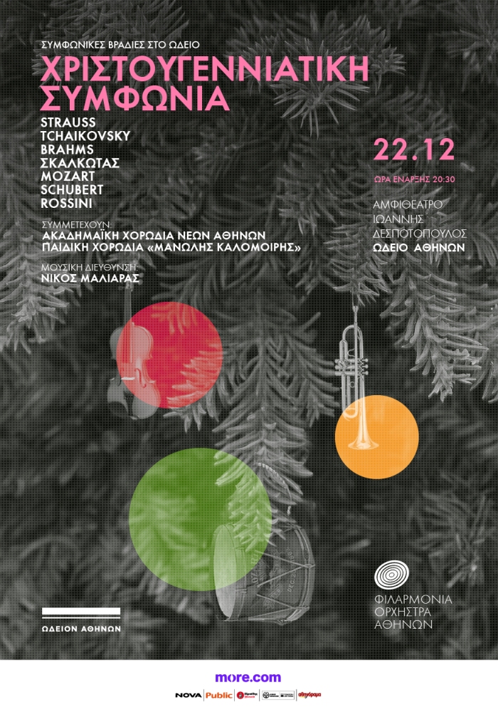 Χριστουγεννιάτικη γιορτή στο Ωδείο Αθηνών με έργα Στράους, Τσαϊκόφσκυ, Μασκάνι, Σκαλκώτα, Γκουνώ, Μότσαρτ, Χάυντν, Μπραμς, Σούμπερτ, Ροσίνι, Μπιζέ, Ραμίρεζ και αγαπημένες γιορτινές μελωδίες που όλοι θα τραγουδήσουν!