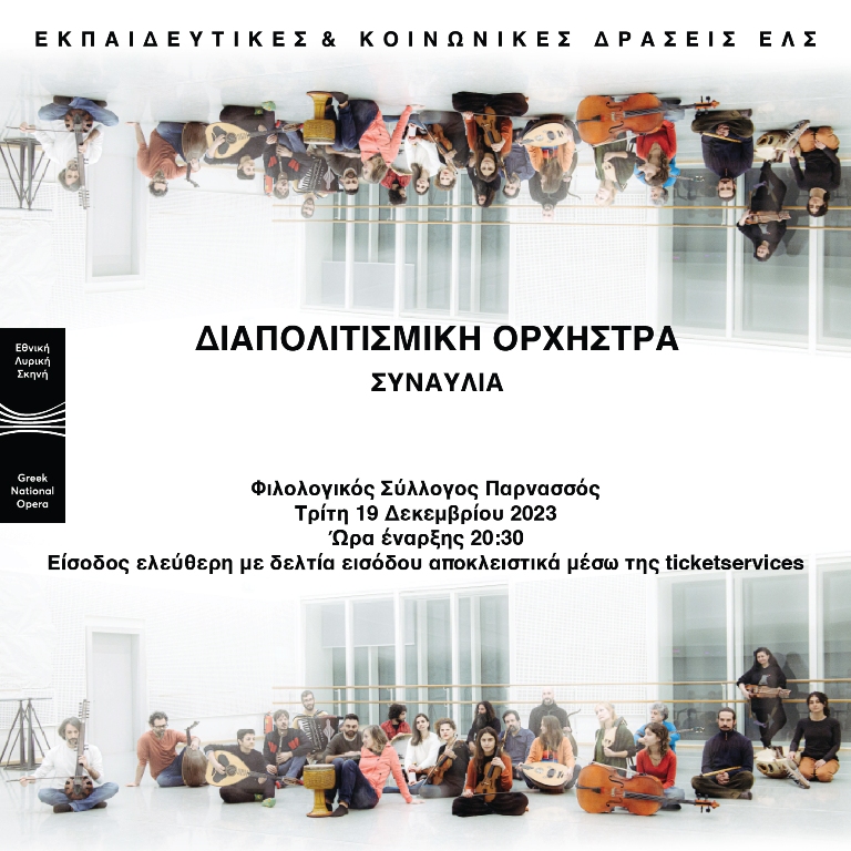 Η Διαπολιτισμική Ορχήστρα της Εθνικής Λυρικής Σκηνής αποχαιρετά το 2023 με μια μοναδική συναυλία την Τρίτη 19 Δεκεμβρίου 2023 στις 20.30 στον Φιλολογικό Σύλλογο Παρνασσός, με ελεύθερη είσοδο για το κοινό.