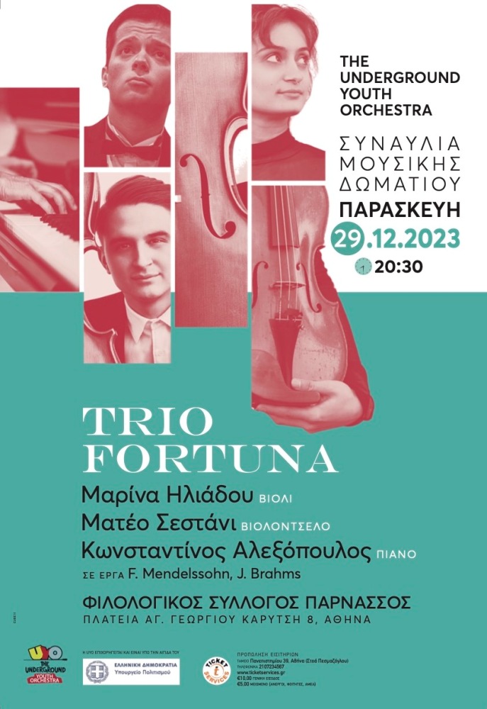 Το Trio Fortuna - η Μαρίνα Ηλιάδου (βιολί), ο Ματέο Σεστάνι (βιολοντσέλο) και ο Κωνσταντίνος Αλεξόπουλος (πιάνο)- θα πραγματοποιήσει την Παρασκευή 29 Δεκεμβρίου 2023 μια Χριστουγεννιάτικη συναυλία μουσικής δωματίου με έργα Μέντελσον και Μπραμς στον Φιλολογικό Σύλλογο «Παρνασσός».