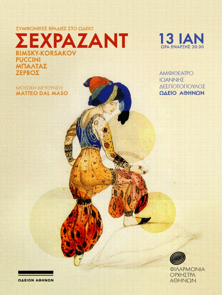 Η αυλαία των Συμφωνικών βραδιών της Φιλαρμόνιας Ορχήστρας Αθηνών στο Ωδείο Αθηνών για το 2024 ανοίγει στις 13 Ιανουαρίου, με μια πολυαναμενόμενη συναυλία, ο τίτλος της οποίας αναφέρεται σε ένα έργο-ογκόλιθο για το συμφωνικό ρεπερτόριο: Σεχραζάντ, του Νικολάι Ρίμσκι-Κόρσακοφ. Τη συμφωνική αυτή σουίτα ο Ρώσος συνθέτης συνέθεσε το καλοκαίρι του 1888, εμπνευσμένος από το αριστούργημα της αραβικής λογοτεχνικής παράδοσης Χίλιες και μία νύχτες. Το έργο αυτό είναι σίγουρα το σπουδαιότερο και το πιο γνωστό του. Ταυτόχρονα άσκησε τεράστια επίδραση στους μεταγενέστερους τόσο ως προς το ύφος όσο και για την εξαιρετικά πλούσια και ευρηματική ενορχήστρωσή του, και κατέταξε τον Ρίμσκι-Κόρσακοφ ανάμεσα στους κορυφαίους συνθέτες και ενορχηστρωτές όλων των εποχών.