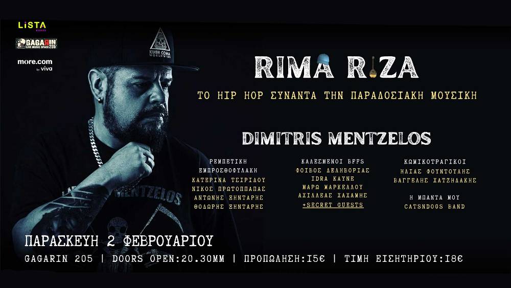 Ο Δημήτρης Μεντζέλος, γνωστός από το Hip Hop group Ημισκούμπρια, ανεβαίνει στη σκηνή του συναυλιακού χώρου Gagarin205, παρουσιάζοντας μια παράσταση με τίτλο “RIMA RIZA”.