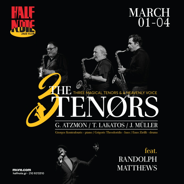 Τρία κορυφαία τενόρα σαξόφωνα της Ευρωπαϊκής αλλά και της παγκόσμιας jazz μ ’έναν έξοχο vocalist κι ένα φανταστικό rhythm section, συγκροτούν αυτό το supergroup που θα παρουσιαστεί στο Half Note Jazz Club, από Παρασκευή 1 έως και Δευτέρα 4 Μαρτίου.