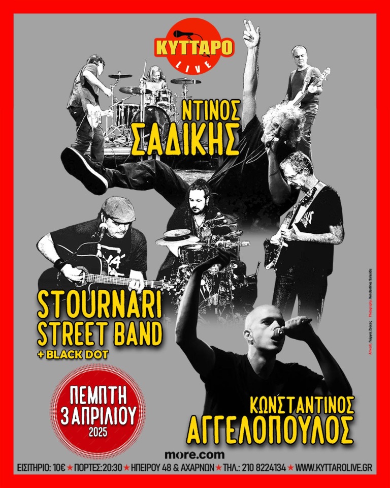 Τρεις διαφορετικές γενιές της Ελληνόφωνης Ροκ σκηνής, ο καταξιωμένος πάντα πειραματικός και ανεξάντλητος Ντίνος Σαδίκης (Εν Πλω κ.α), οι νεοσύστατοι και εντελώς πρωτότυποι Stournari Street Band (μέλη από Magic de Spell, Διάφανα Κρίνα κ.α) και το “next big thing” της σκηνής μας, ο Κωνσταντίνος Αγγελόπουλος (Τσοπάνα Rave 2020+), ανεβαίνουν για πρώτη φορά στη σκηνή του Κυττάρου και παρουσιάζουν τα νέα τους project, μαζί με κλασικά και αγαπημένα, σε μια σπάνια σύμπραξη, την Πέμπτη, 3 Απριλίου!