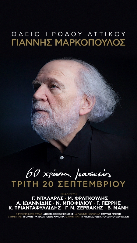 60 χρόνια πορείας στη μουσική και συνεχόμενης δημιουργίας συμπληρώνει φέτος ο Γιάννης Μαρκόπουλος. Ο μεγάλος μας συνθέτης, ο σημαιοφόρος του κινήματος της επιστροφής στις ρίζες, ο μουσικός που με το όραμά του έκανε τομή στα μουσικά πράγματα της δεκαετίας του ’70 και έδωσε άλλη ταυτότητα στη σύγχρονη ελληνική μουσική, γιορτάζει αυτή τη λαμπρή επέτειο με μία μεγάλη συναυλία στο Ηρώδειο.
