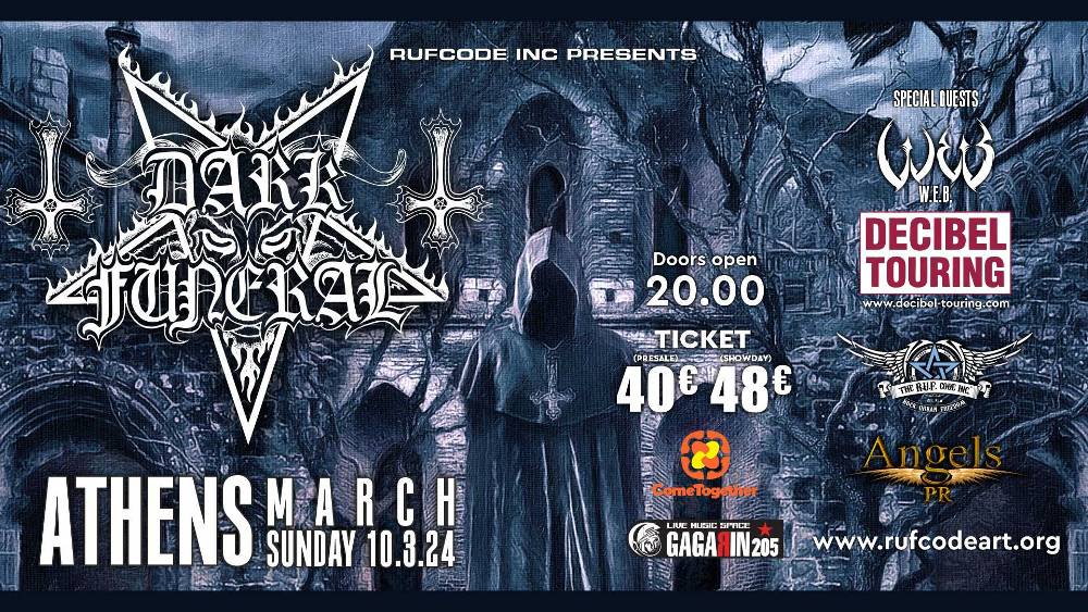 Οι Dark Funeral, ένα από τα σημαντικότερα σουηδικά black metal σχήματα που για πάνω από 30 χρόνια υπηρετεί με συνέπεια την τέχνη του, και γι’ αυτό χαίρει του σεβασμού των απανταχού black metallers, επιστρέφουν στην Ελλάδα, δυο χρόνια μετά την κυκλοφορία του εξαιρετικού «We Are The Apocalypse» για μια μοναδική εμφάνιση που θα καλύψει ολόκληρη την ιστορία τους.