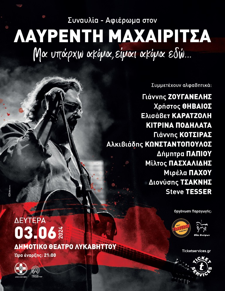 Οι φίλοι, συνοδοιπόροι και συνεργάτες του, θα βρεθούν για μια μοναδική συναυλία την Δευτέρα 3 Ιουνίου στο Δημοτικό Θέατρο Λυκαβηττού, όπου θα θυμηθούμε και θα τιμήσουμε τον Λαυρέντη Μαχαιρίτσα, τον ερμηνευτή των επιτυχιών, της ευαισθησίας και της ανθρωπιάς, που άνοιξε μουσικούς δρόμους και διαμόρφωσε μουσικό στυλ, σφραγίζοντας μελωδικά και υπέροχα τα ακούσματά μας.