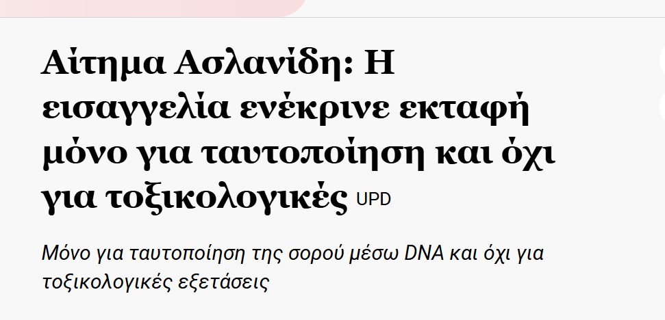 Ο πιο ακριβής τίτλος λοιπόν ήρθε από την Αυγή: «Μερικώς δεκτό το αίτημα Ασλανίδη για εκταφή - Όχι της εισαγγελέα στις τοξικολογικές». Σε αντίθεση με τον ΣΚΑΙ, «Δεκτό το αίτημα του Παύλου Ασλανίδη για εκταφή του γιου του» - ο οποίος φυσικά και δεν λέει ψέματα, εννοείται ότι δεν είναι fake news, όμως; Η εντύπωση που λέμε.