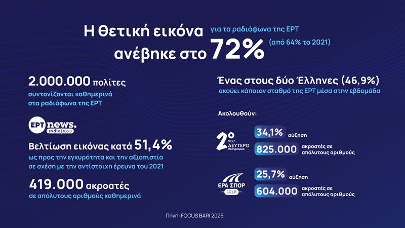 Ο Κώστας Παπαβασιλείου πρόσθεσε ότι το ποσοστό ακροαματικότητας των δημόσιων ραδιοφώνων έχει αυξηθεί κατά 43% από το 2019, και η Μαρία Κοζάκου ότι -με βάση, πάντα, την έρευνα της Focus-Bari- ένας στους δύο ακροατές (46,9%) συντονίζεται σε κάποιον σταθμό της ΕΡΤ μέσα στην εβδομάδα, ενώ ένας στους τέσσερις (25%) το κάνει σε καθημερινή βάση.