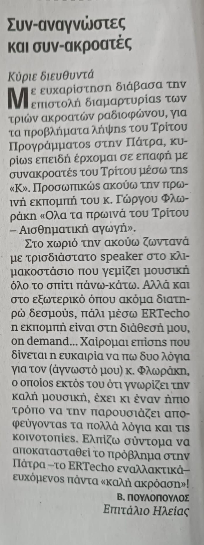 Τρεις ακροατές του Τρίτου στην Πάτρα, οι Τ. Κόντογλη, Δ. Μακρίδης και Ν. Πρέσσας έστειλαν επιστολή στην Καθημερινή σχετικά με το θέμα που αναδείξαμε στο e-tetRadio από τις πρώτες ώρες που συνέβη η αλλαγή (είχαμε πολλές διαμαρτυρίες από την Πάτρα).