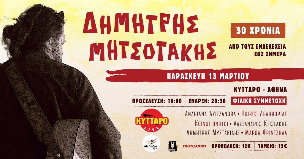 Ο Δημήτρης Μητσοτάκης επιστρέφει στο ΚΥΤΤΑΡΟ, την Παρασκευή 13 Μαρτίου σε μια συναυλία-γιορτή για όλα όσα καταφέραμε να κρατήσουμε ζωντανά, για όσα γράφτηκαν για να ακουστούν δυνατά, κι άλλοτε πάλι σαν ψίθυρος και σαν εξομολόγηση.