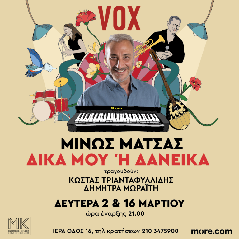 11 Φεβρουαρίου 2026Ο Μίνως Μάτσας έρχεται στη σκηνή του VOX, σ΄ έναν από τους πιο σύγχρονους και φιλόξενους χώρους της Αθήνας, για δύο μοναδικές μουσικές βραδιές με τίτλο «Δικά μου ή Δανεικά», τις Δευτέρες 2 & 16 Μαρτίου.