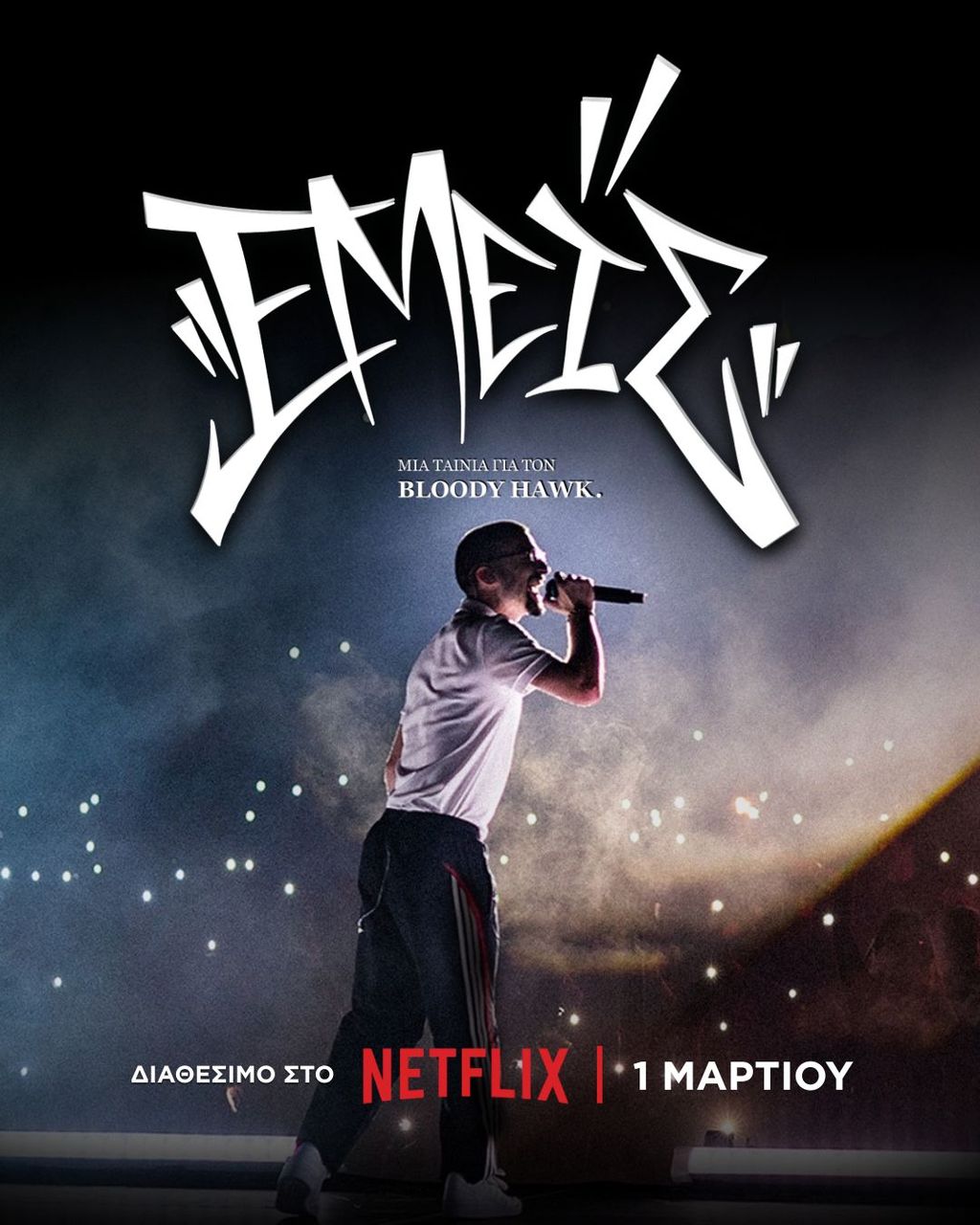Το πετύχαμε ήδη στα «προσεχώς» της πλατφόρμας, η επιτυχημένη ταινία «ΕΜΕΙΣ: Μια Ταινία για τον Bloody Hawk» κάνει πρεμιέρα στο Netflix την 1η Μαρτίου. Είναι ένα ντοκιμαντέρ για έναν από τους πιο διάσημους (και καλούς) εκπροσώπους της ελληνικής χιπ χοπ σκηνής, που βγήκε στους κινηματογράφους πέρυσι κόβοντας πολλά εισιτήρια. Τώρα ανεβαίνει στο Netflix και αναμένεται κι εδώ να κάνει τρελά νούμερα.