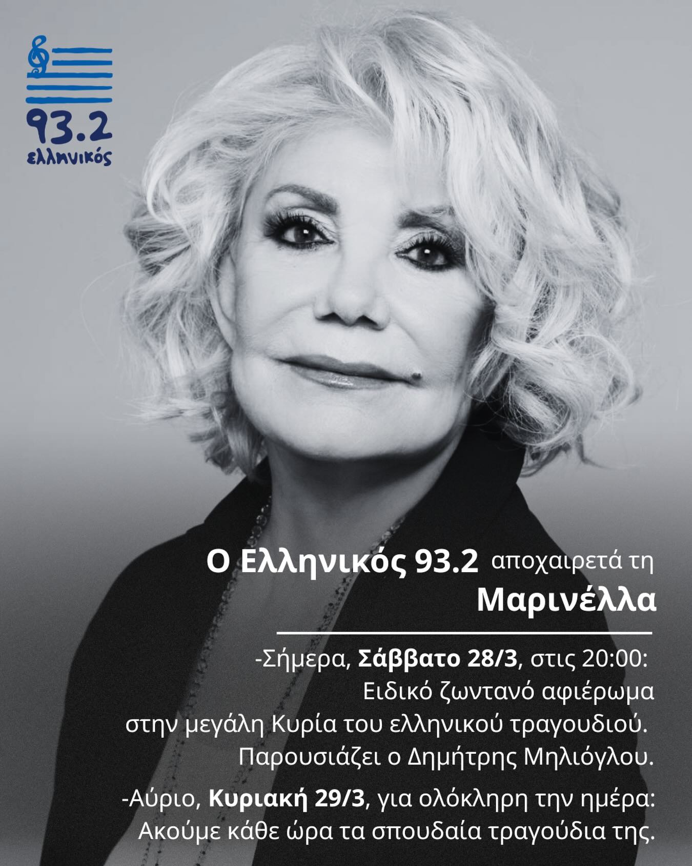 Το Δεύτερο Πρόγραμμα 103.7 αποχαιρετά την Μαρινέλλα, την Μεγάλη Κυρία του Ελληνικού τραγουδιού αλλάζοντας τελείως το πρόγραμμά του. Οι παραγωγοί του σταθμού, ζωντανά στο στούντιο, μιλούν για εκείνη, θυμούνται τις μεγάλες στιγμές της και μεταδίδουν τα πιο αγαπημένα τραγούδια με τη φωνή της.
